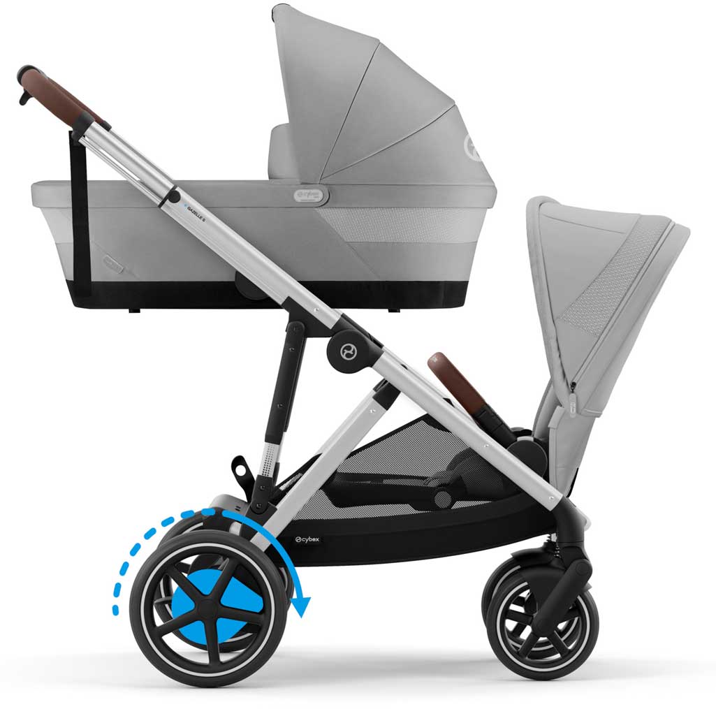 Du kannst diesen Kinderwagen nicht nur für ein Kind nutzen. Dieser Kinderwagen kann ebenfalls als Geschwisterkinderwagen verwendet werden. Dein Neugeborenes liegt bequem und gut geschützt in der Babywanne, hingegen das größere Kind in der Sitzeinheit der e-Gazelle sitzt. Die neue e-Gazelle passt sich deinen Anforderungen mit nur leichten Klicks immer an.