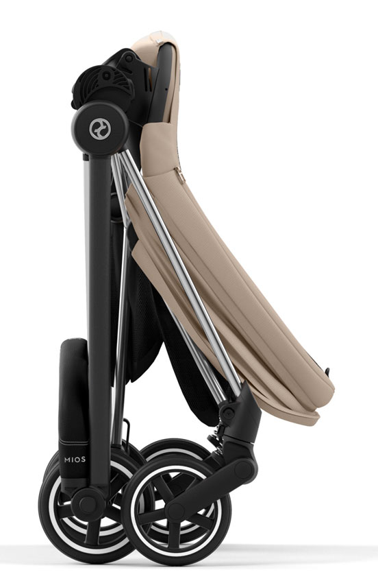Um den Mios zu transportieren faltest du ihn mit nur einer Hand. Das gefaltete Paket steht dann ganz von selbst. Gefedert ist der Mios an allen Rädern und bietet so höchsten Fahrkomfort.