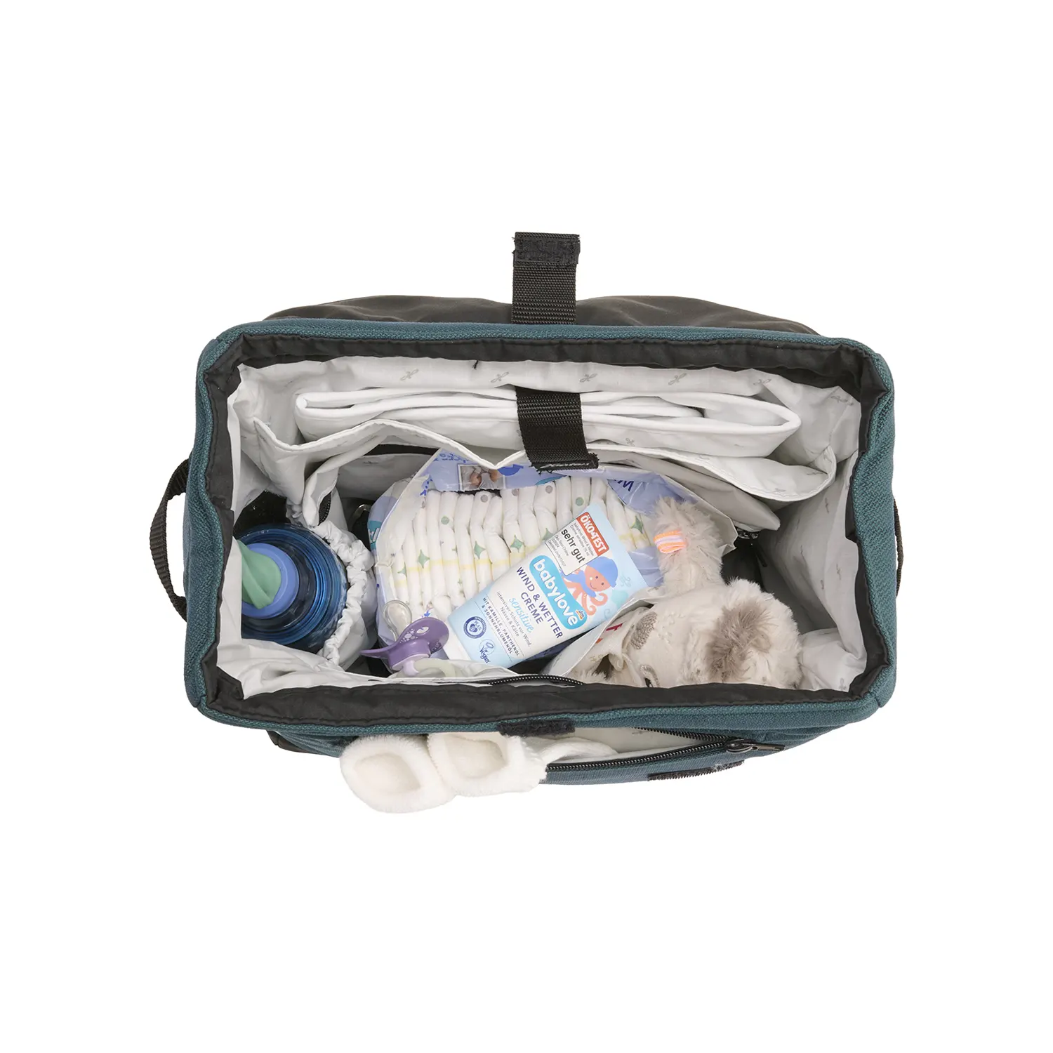 Die durchdachte Inneneinteilung sorgt dafür, dass Windeln, Feuchttücher, Fläschchen, Snacks oder Wechselkleidung jederzeit griffbereit sind. Zwei große Seiten-Außentaschen bieten schnellen Zugriff auf wichtige Essentials – ideal für spontane Situationen.