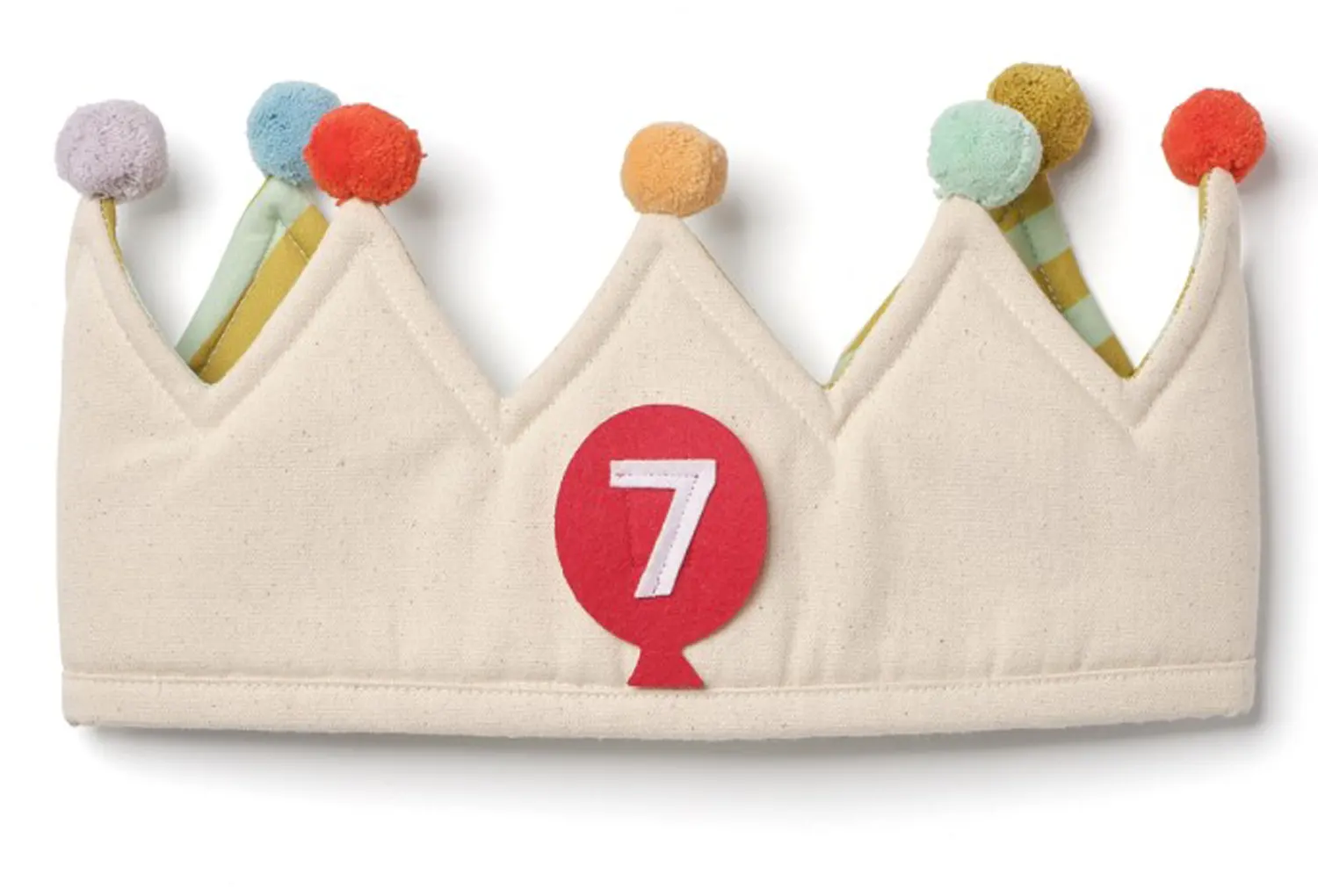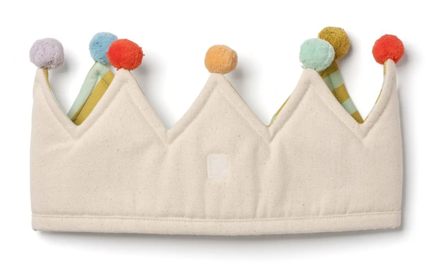 Die kleinen, verspielten, farbenfrohen Details an der Krone sorgen für den ganz besonderen Auftritt. Auf der Innenseite befindet sich ein diagonales Streifenmuster und den oberen Teil der Krone schmücken kleine Pompons. An der Kronenvorderseite gibt es extra Aussparrungen für die austauschbaren Zahlen. Perfekt, denn dadurch begleitet die Krone deinen Schatz durch viele Kindergeburtstage.