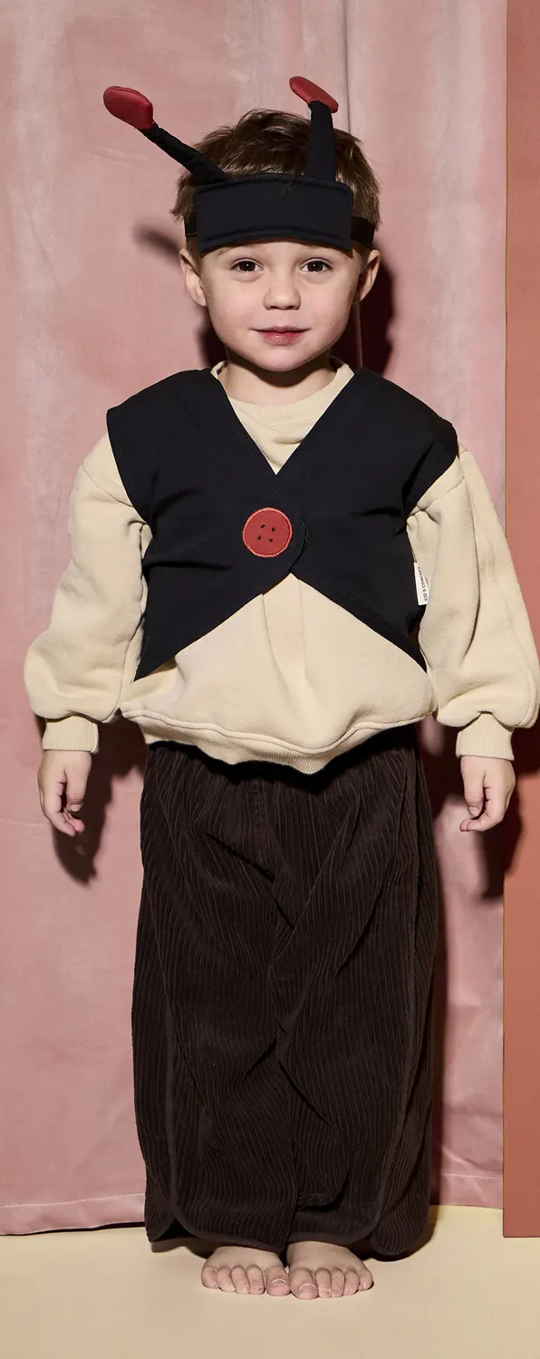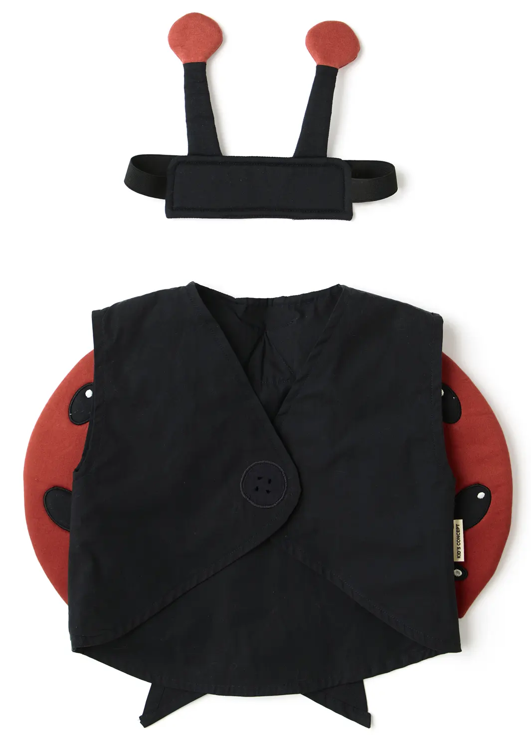 Die weiche schwarze Weste mit den dunkelroten Flügeln und den aufgestickten schwarzen Punkten macht in Windeseile aus deinem Liebling einen kleinen Marienkäfer. Vervollständigt wird das Kostüm durch ein gepolstertes Stirnband mit weichen, biegsamen Fühlern.