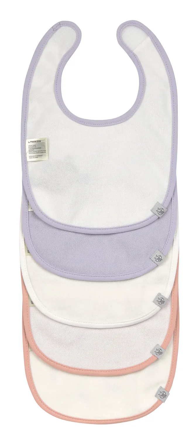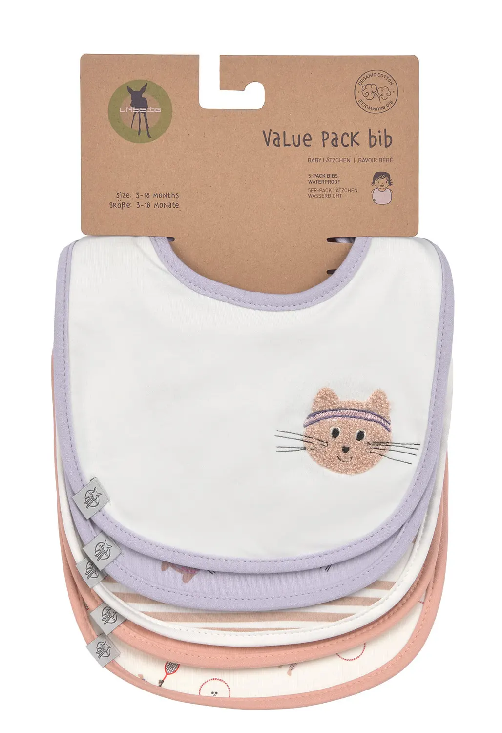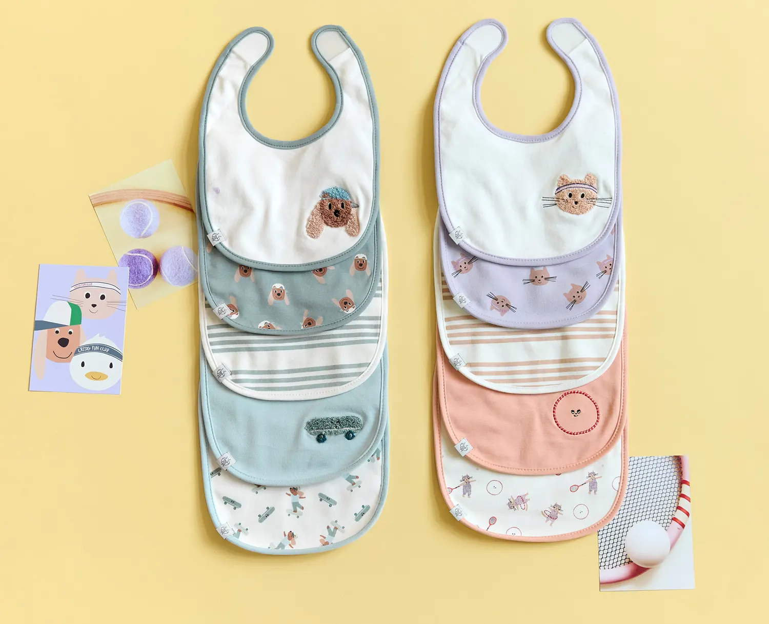 Mit dem Set erhältst du 5 Lässig Lätzchen mit unterschiedlichen Motiven aus der niedlichen Tiny Team-Serie.