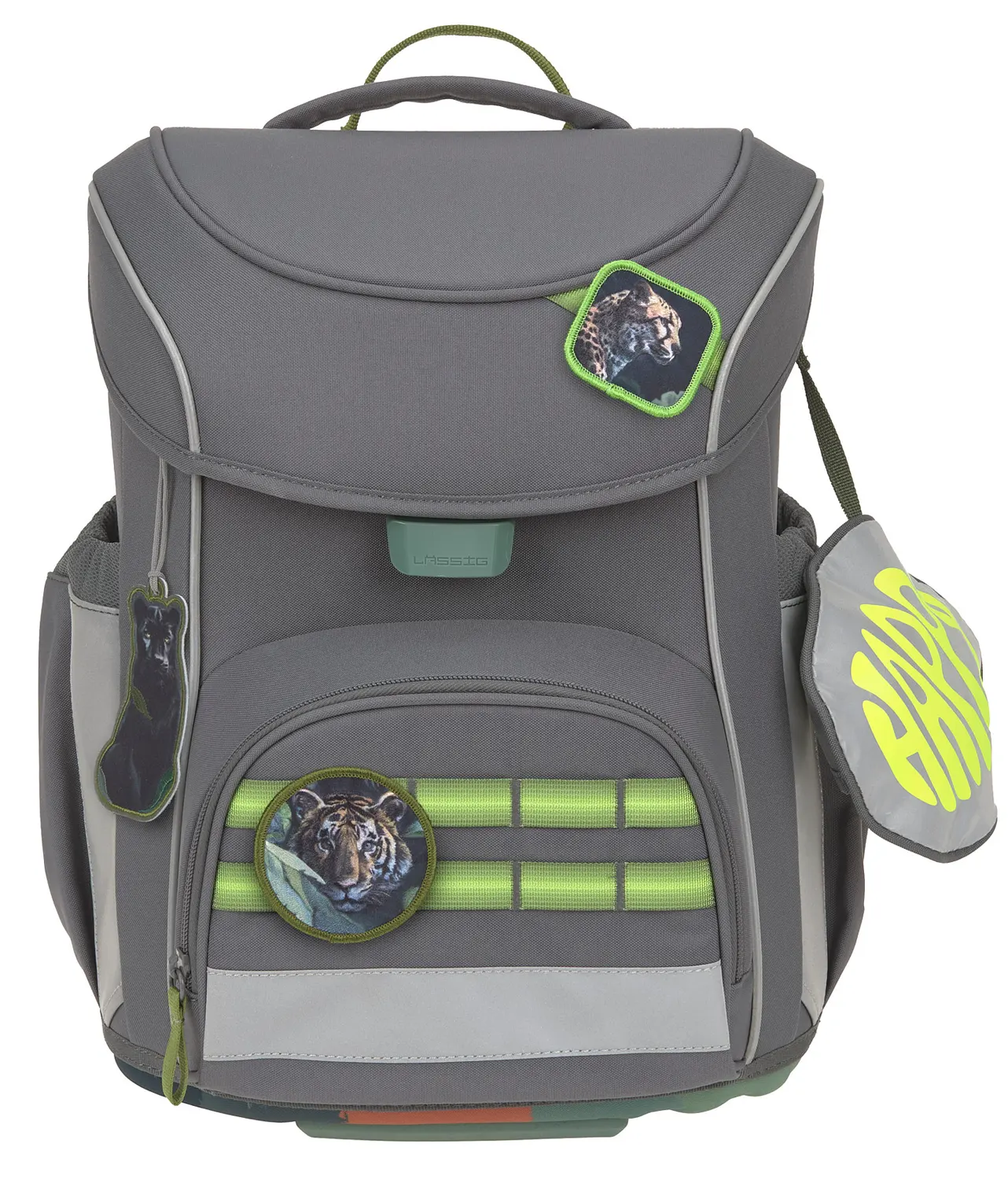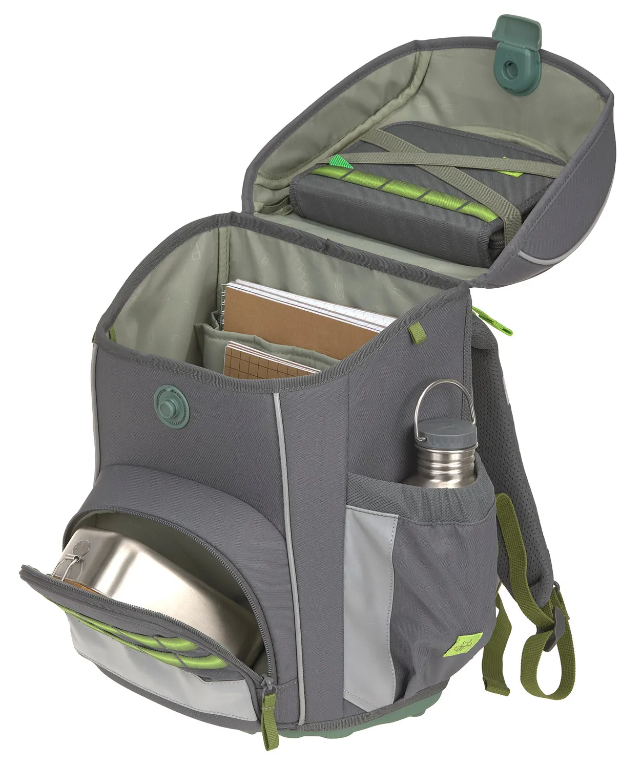 Trotz der kompakten Form bringt der Ranzen viel durchdachten Stauraum mit. Ein großes Bücherfach, ein Fach für die Trinkflasche oder den Regenschirm, ein Seitenfach mit Schlüsselfinder, eine isolierte Fronttasche und eine praktische Befestigungsschlaufe unter dem Deckel, machen die Schultasche zu einem cleveren Begleiter durch den Schulalltag. Mit zusätzlichen Patches und Textilstickern kann dein Schatz seinen Ranzen ganz individuell verschönern.