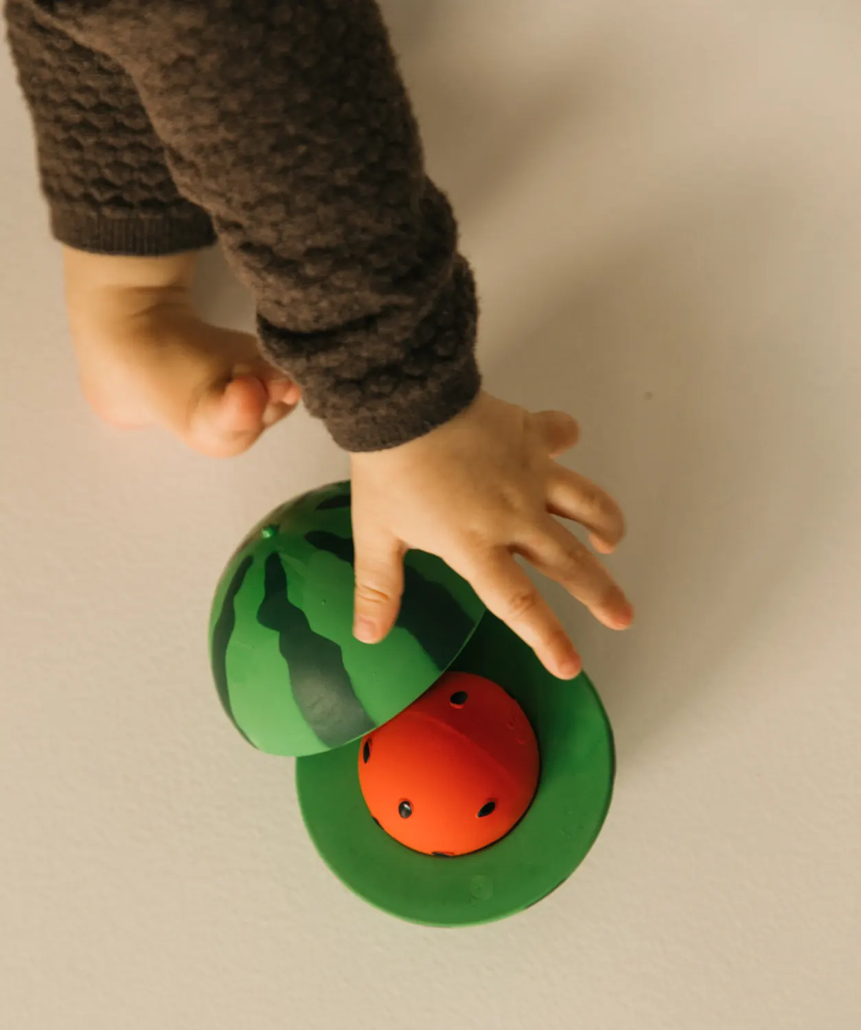 Dürfen wir vorstellen: Wally, die Wassermelone! Wally ist ein echtes Multitalent, denn sie ist als Stapelspiel, als Rassel und als Hüpfball verwendbar.