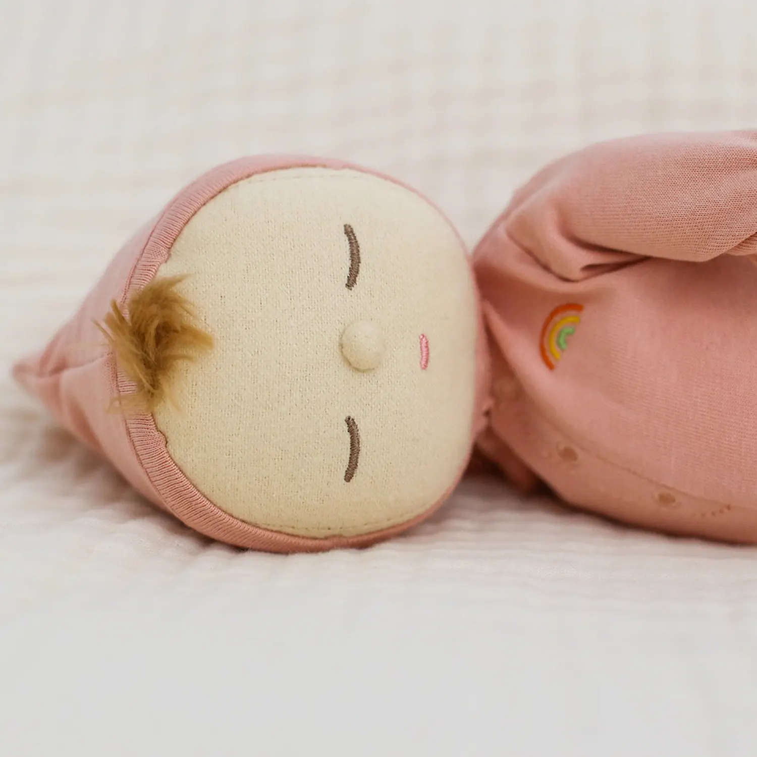 Moppet trägt einen fest vernähten, kuscheligen Strampler aus Baumwolle mit einem aufgestickten Regenbogen über dem Herzen – ein Symbol für Liebe und Geborgenheit. Das niedliche, gestickte Gesicht mit Haarbüschel verleiht ihr einen unverwechselbaren, sanften Ausdruck.