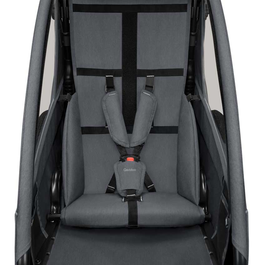 Wie immer hat Qeridoo bei der Sicherheit keine Kompromisse gemacht. Der höhenverstellbare Schiebegriff bietet die einzigartige Kopfprotektorfunktion der höherpreisigen Modelle und schließt damit eine gefährliche Sicherheitslücke im Falle einer Gefahrensituation. Im Trailer-Modus dient er außerdem als Überrollbügel.Und auch mit dem integrierten 5-Punkt-Gurtsystem beweist Qeridoo, dass schickesDesign und maximale Sicherheit nicht unbezahlbar sein müssen.