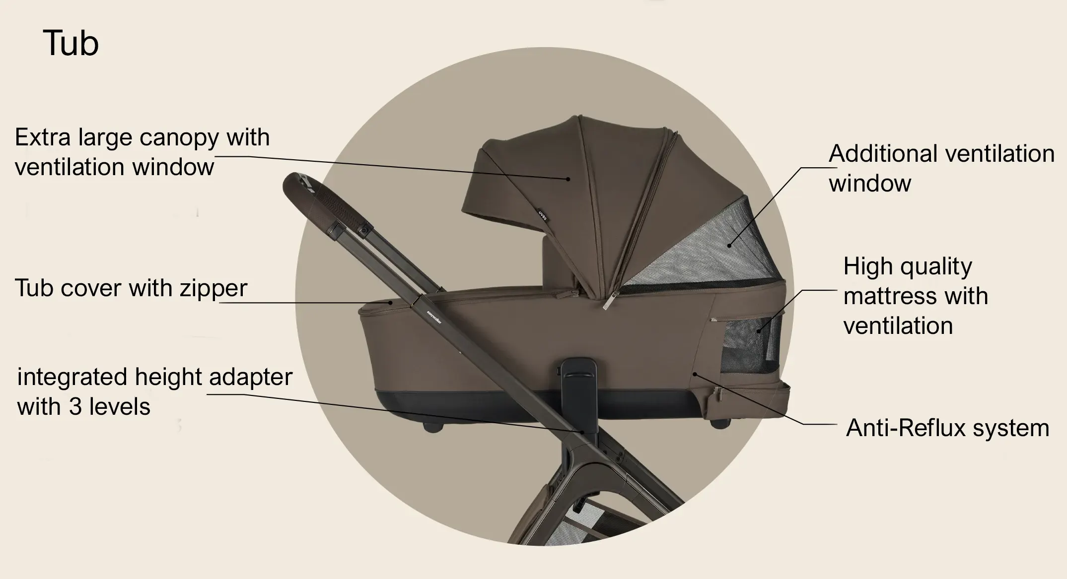 - Expandable canopy, UPF 50 and water-repellent
