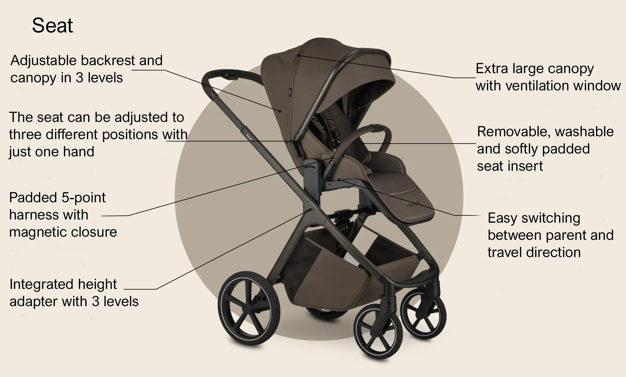 - Height-adjustable push handle, canopy and backrest