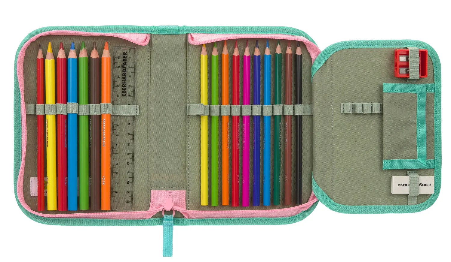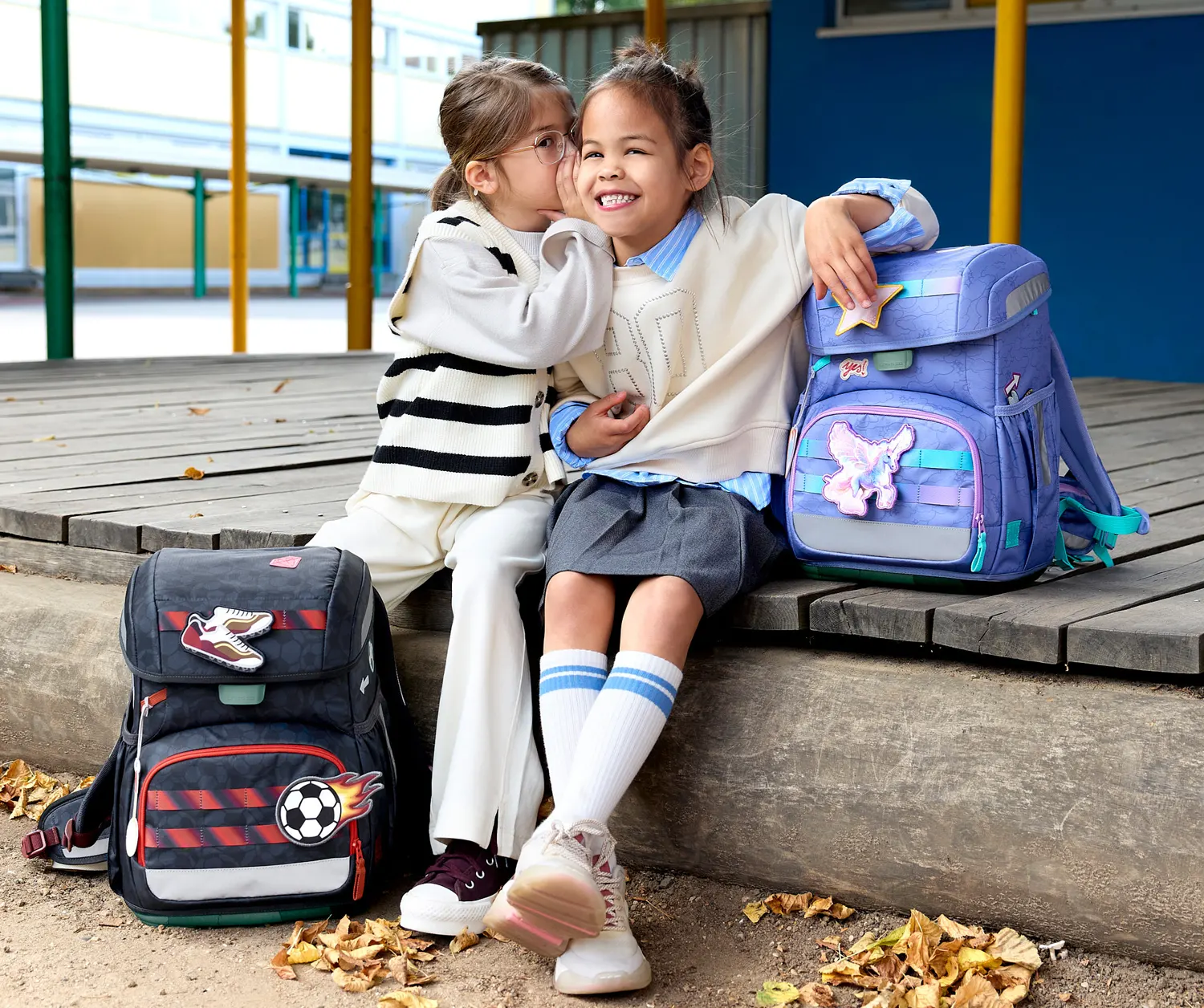 The set includes a rain cover, a fully equipped pencil case, a pencil pouch that converts into a pen holder, and a gym bag that can be attached to the schoolbag.