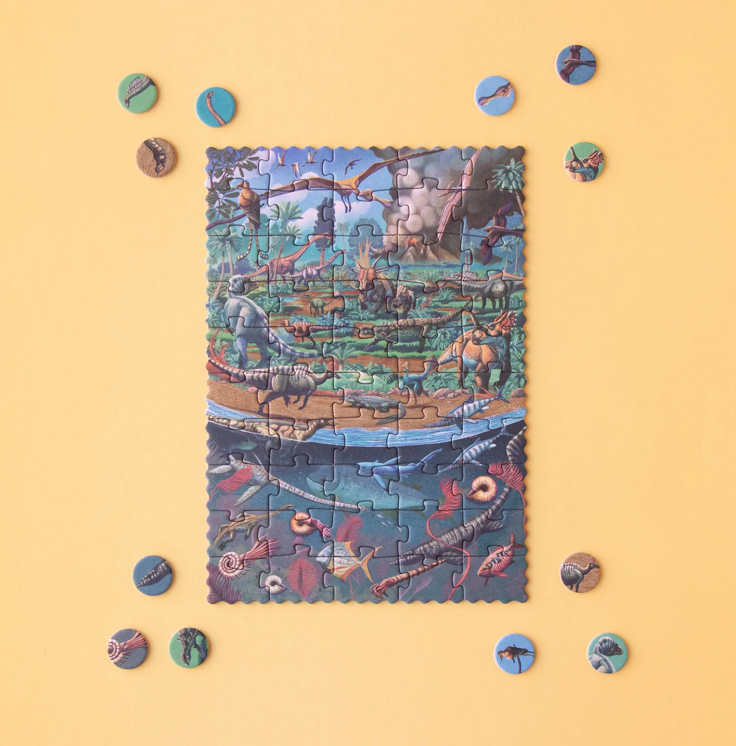 This beautifully designed 50-piece mini puzzle takes children on an exciting journey into prehistoric times. As they piece it together, they’ll discover 12 special puzzle pieces that teach fun facts about different dinosaurs: